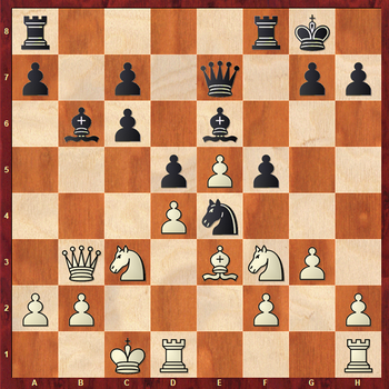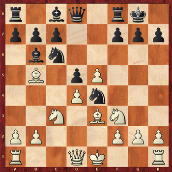 Подметив тактический мотив на диагонали h5-d1, Семен Ханин идет на выигрыш качества. Возможно, черные «продешевили». Заслуживало внимания 14...Rab8 15.Qa4 (или 15.Qc2 Ba5) 15...Bd7, беспокоя неприятельского короля.