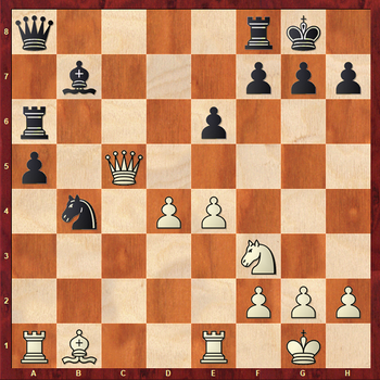 15...a5 16.0–0 Nb4 17.Bb1 Ra6 18.Re1 Qa8?! Странное решение. Черные уводят все свои фигуры на ферзевый фланг, забывая про своего короля. Неплохо смотрелось 18...Re8 c дальнейшим 19...Re7 укрепляя на всякий случай cедьмой ряд.